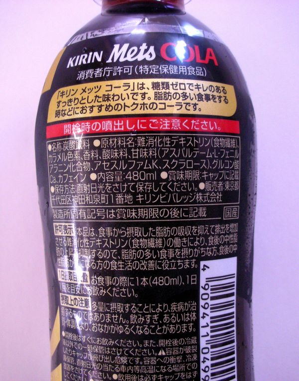 メッツコーラの成分表示。人工甘味料、カルシウム強化剤などの対策はしているが、カラメル色素の対策はしていなかった。 |