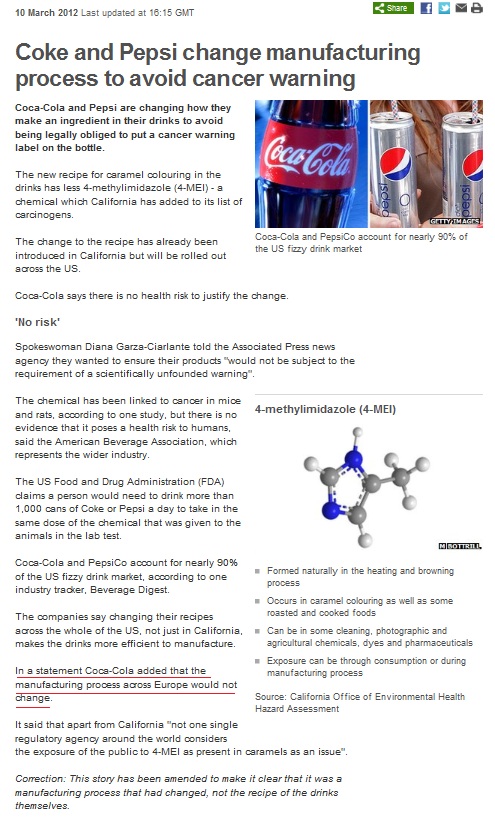 そのほぼ同時期、アメリカのカリフォルニア州では、コーラの色の主原料であるカラメル色素に含まれる発がん物質「4-メチルイミダゾール」(4-MI)に対する懸念が浮上していた。2011年1月には、この「4-MI」が州の発ガン物質リストに追加された。