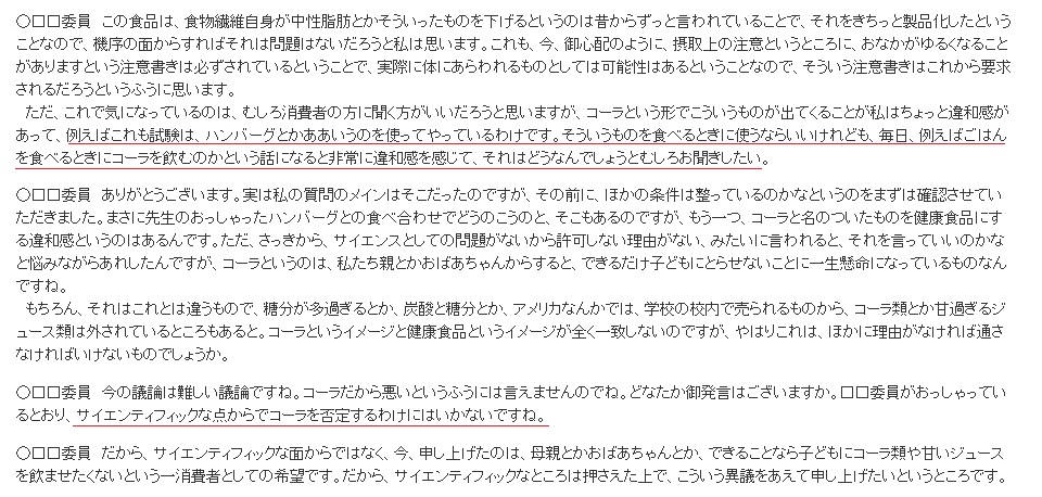 2010年12月の部会の会議では、コーラをトクホに認めるべきかという点について「ハンバーグなど高脂肪食の時だけに使うのならいいけれども、毎日たとえばご飯を食べるときにもコーラを飲むのかという話になると非常に違和感を感じる」などといった意見が出されていた。