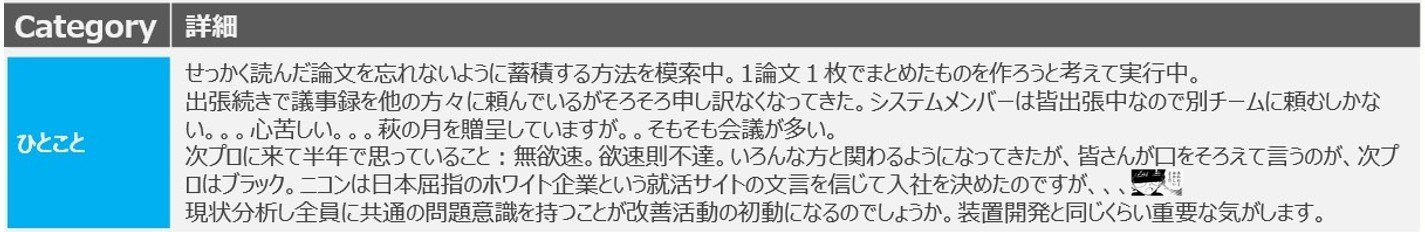 以下は、新卒入社して次世代プロジェクト本部に配属となり、当時まだ入社2年目だった総合職エンジニアBさん(女性)の『業務週報』(2022年6月24日)内に記された『ひとこと』コメントだ。Aさんと同じプロジェクトに、Aさんが入社する前から配属されていた人物である。