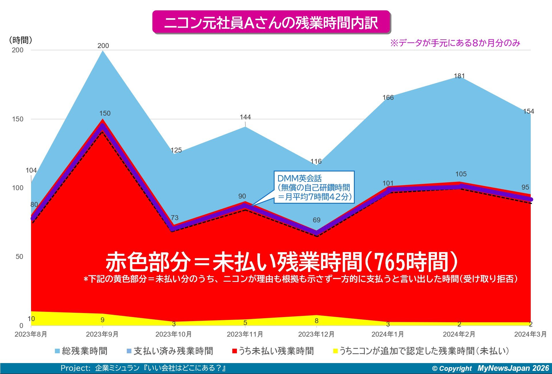 Aさんは異常な仕事の振られ方に気づき、入社半年後から業務用PCの起動~終了データや労務データをダウンロードして記録するようになった。以下が、Aさんが体調を崩して辞める直前8か月間の、残業時間内訳だ。未払い分だけで、実に765時間にのぼる。この職場環境は、Aさんだけが狙い撃ちされたわけではなく、本部全体に蔓延していたという。