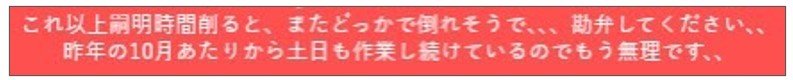 「これ以上睡眠時間削ると、またどこかで倒れそうで、、、 勘弁してください、、 昨年の10月あたりから土日も作業し続けているのでもう無理です、、」